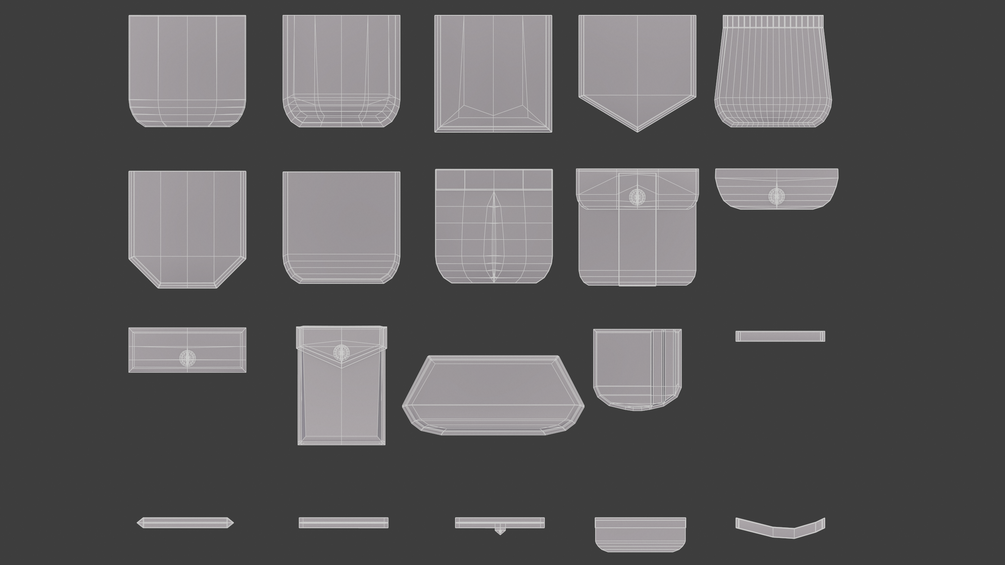 This is a collection of 20 different pockets in one IMM/VDM brush for zBrush. All models are very lowpoly and bevelled for optimal subdivisions and include UV's. Perfect for quickening your workflow. This package includes: VDM Brush Alpha Images IMM Brush